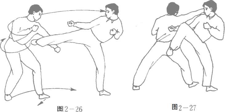 又比如,对方提右脚直踹我腰,我左臂由左向右横推对手 右脚腿肚子,使其右脚失去平衡此时,我以左脚为轴,右转体 180。,借转体之力,右手猛 拳,可中其后腰要害!图 26、 27)