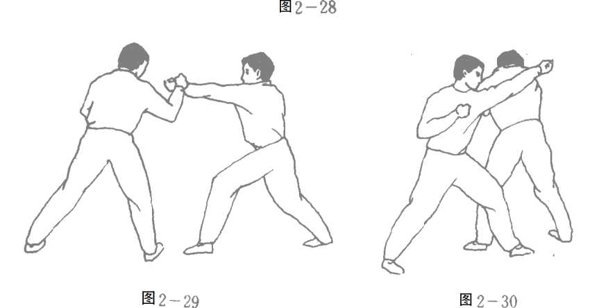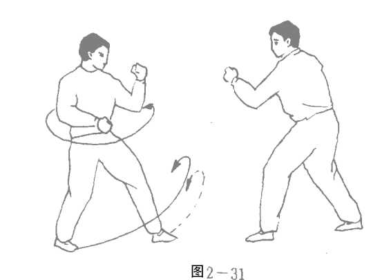 圆转的好处,一是发动身体继续左转;二是右手右脚的旋 转过程即是化去对手来力的过程。比如,对手上左脚以左拳打 我头部,我上体弧形左转上右脚,右臂由右向左掩带其左臂, 化其来力。随之,我上体继续左转180。,同时左拳随转体狠狠 抽击其后颈,效果绝不会差!图2—28、29、30)