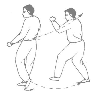180。转体鞭手用于防守反击,那简直是完美无缺的招儿! 在上体旋转的同时,前臂随之掩带,以横破直,化消敌人的直 线攻击。并且,上体一旋,便不再停顿,继续旋,旋1801同时 发鞭手,一旋即发,真是妙不可言。