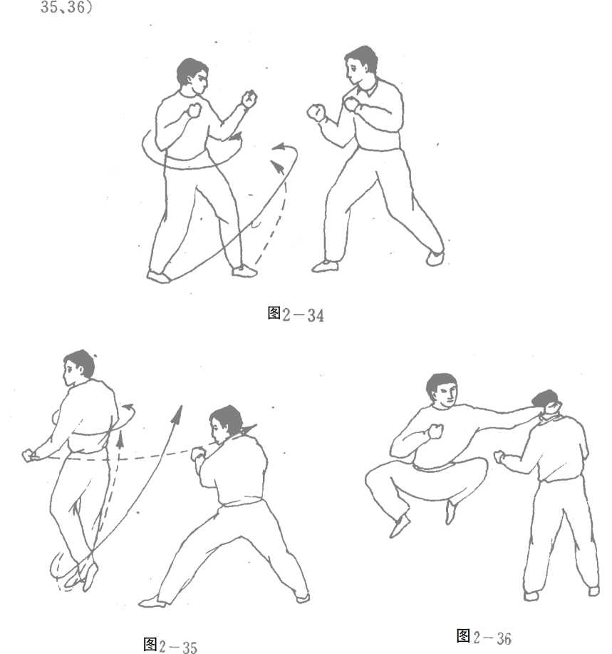 力,又有居高临下的气势,加之身体旋转产生的切线劲力,以 及鞭手的横向抽击力,使得这一拳具有摧毁效应!图2—34、