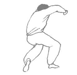 同时,右手屈臂成"”型,从右上方向左下方斜斜挥击。