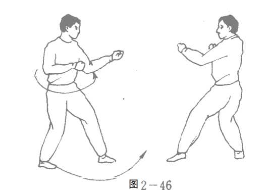 旋身霹雳拳实战法请见(图2—46、47、48)。