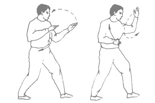 接上动,右手以小臂尺骨侧及手掌侧这一段为力点, 从前经中线向左后向下斜斜划弧,至左肩前;左手从左腹前向 左外侧划弧。同时,上体继续左转。
