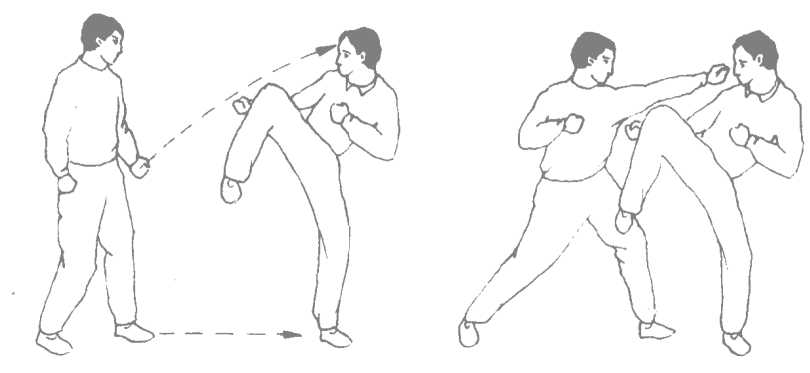 左脚前移数寸,左手发力时重心前移,由于这两个原因使 对方右腿攻我时,已全然失去杀伤力,不过废腿一条而已,不 必担心他会踢伤我!