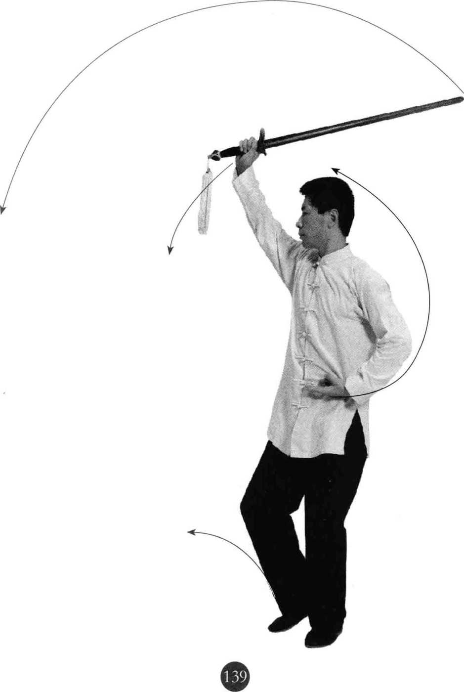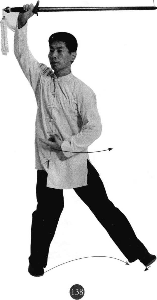 ① 接上动,屈右膝,重心向右腿方向平移,大于90度扣右脚; 同时上体右后转,右手保持举剑状态,左手剑指顺势外旋沿弧线下落 至腹前,掌心向上;目视右后方。