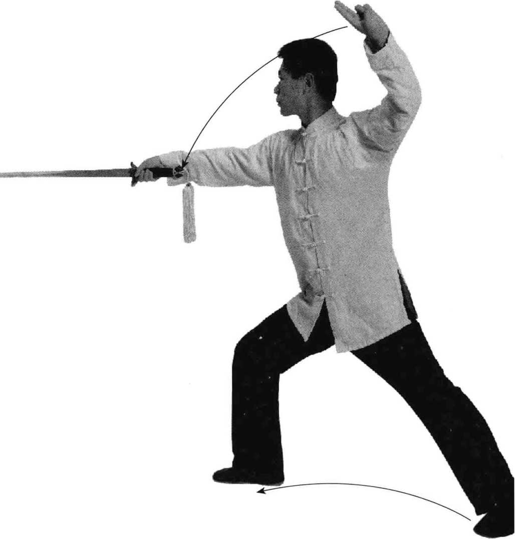 ③弓步劈剑:向右后方约30度方向出右脚,脚跟着地,右虚步, 重心向右腿方向平移,蹬左腿,成右弓步;同时右手持剑下劈,剑与 胸同高,力达剑身中前段,左手剑指向后反撩至头的左后上方,掌心 向外,剑指向前;目视剑尖前方。