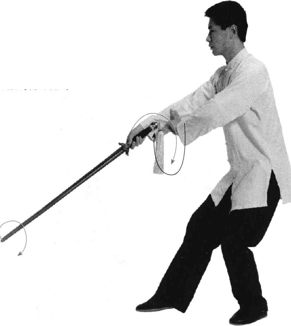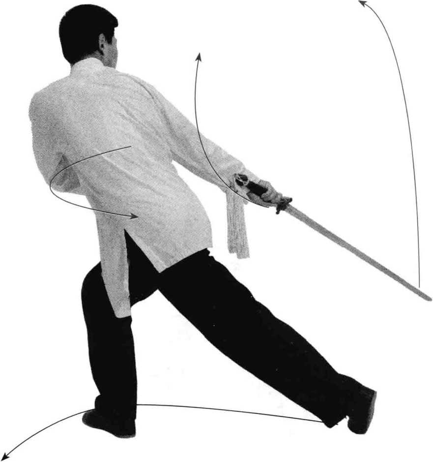 ① 转身后扫:外摆右脚脚尖约45度,身体前俯,蹬起左脚脚跟, 左胯内扣,成叉步;同时上体右后转,右手持剑向右斜后下方扫剑, 掌心向内,力达剑下刃前段,左手剑指顺势沿弧线向下收至右胸肩内 侧,掌心向后;目视剑身前段。