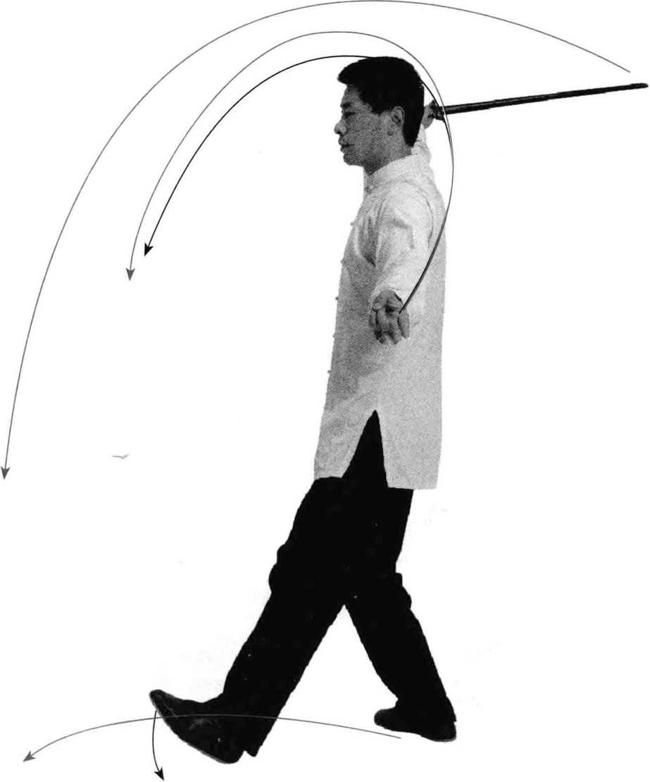 ③ 虚步抡劈:向外约45度摆左脚脚尖,落左脚,屈左膝,身体 重心向前平移至左腿,向前出右脚,脚尖点地,成右虚步;同时上体 向前微倾斜,两手经头上向下抡劈剑,右手持剑斜向下约45度,左 手剑指贴附在右腕内侧;目视剑尖。
