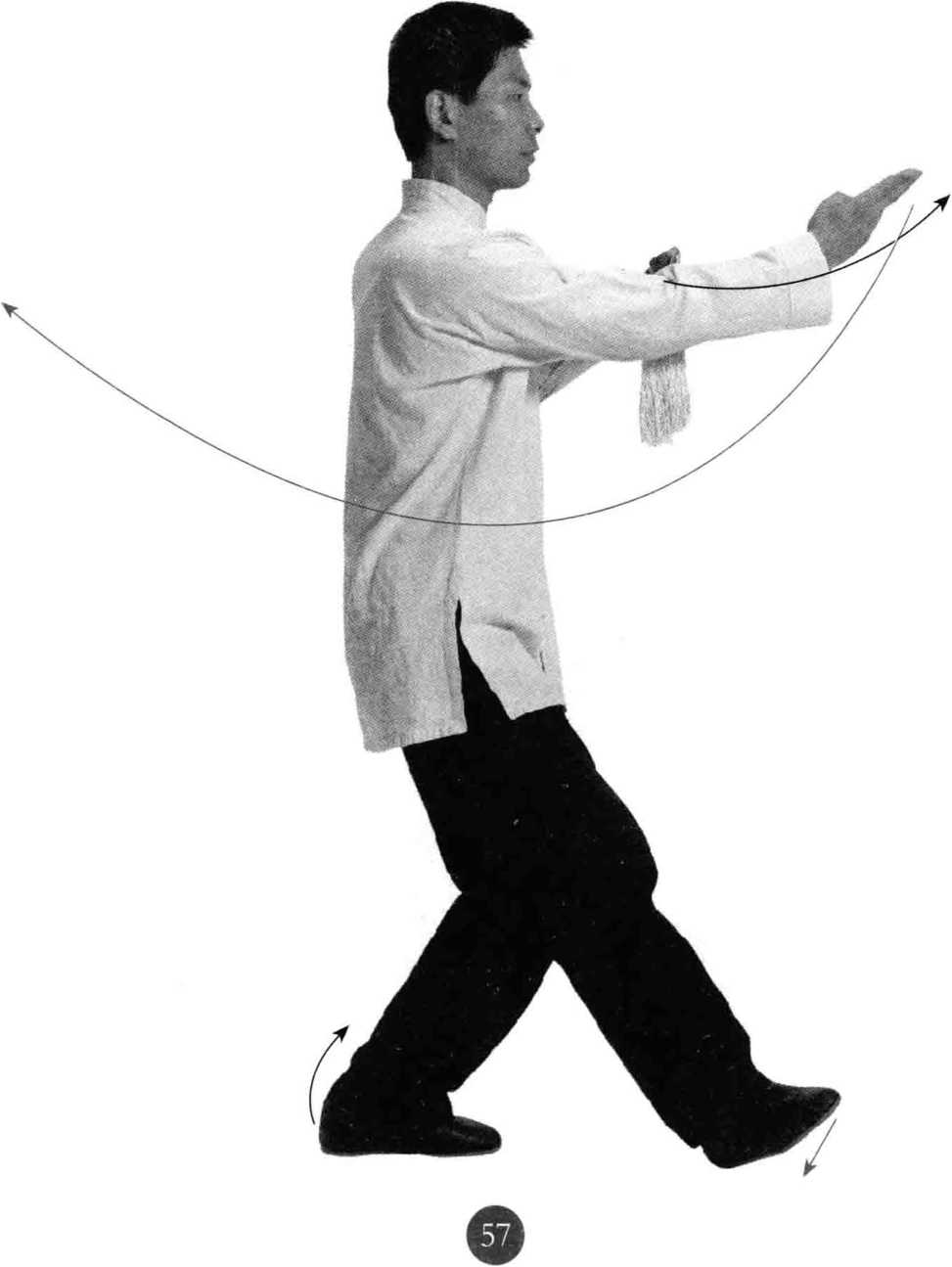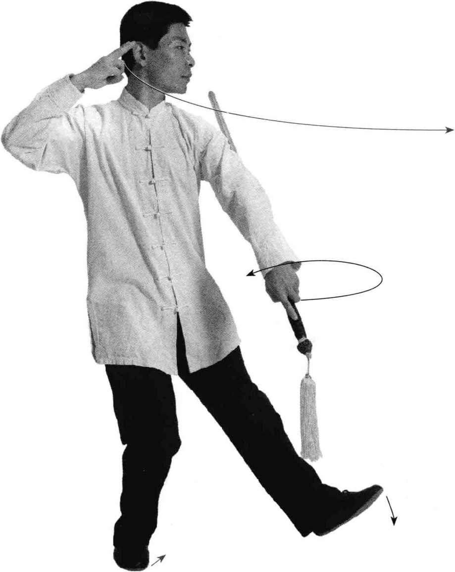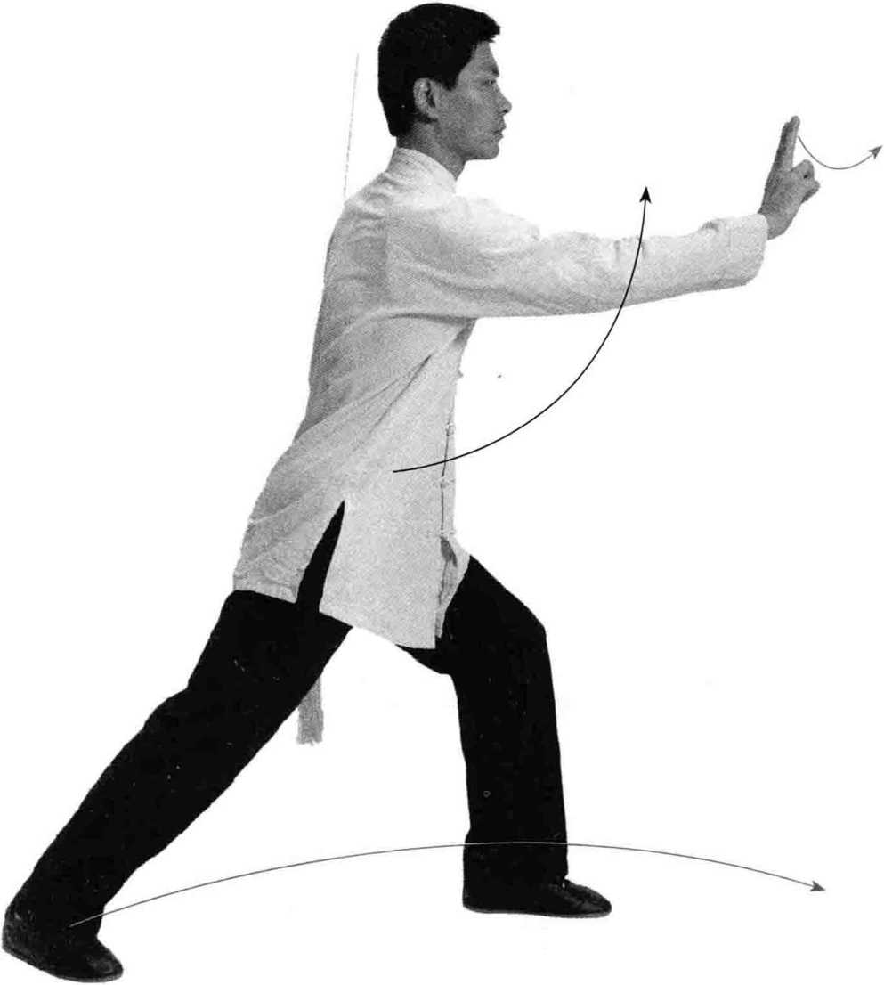 :向左出左脚,脚跟着地,成左虚步;同时右手 成剑指状态随着屈肘动作放于右耳侧,左手伸肘下拦于右胯前;眼睛 平看左侧。要点:此动作应同时出腿、拦剑、收剑指和转头,一气呵成。两肩要 松,上体保持自然。筒TU大极剑入门库解⑥弓步推剑指(仙人指路):屈左膝,蹬右腿成左弓步;同时左 手搂剑把至左胯,右手推剑指向前;两眼平视。要点:弓步搂推动作同步完成,前移重心平稳。⑦盖步拗搭;接上动,重心前移至左腿,右脚上前盖步,脚跟 着地,脚尖外摆;同时右手剑指外旋、掌心向上,左手提剑搭在右手 肘关节内侧;目视剑指前方。
