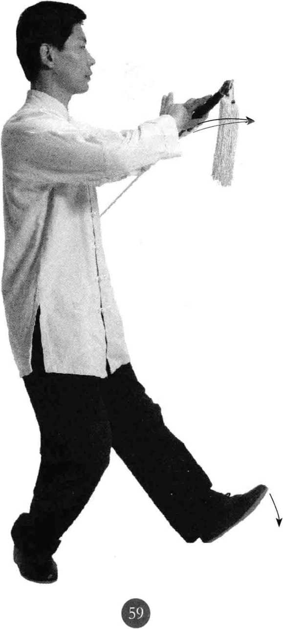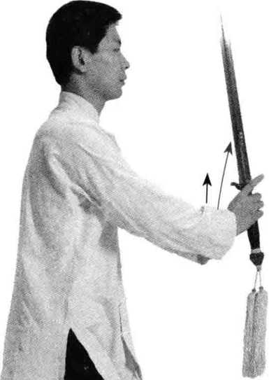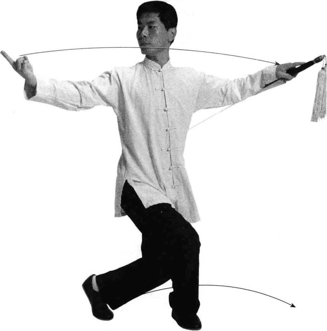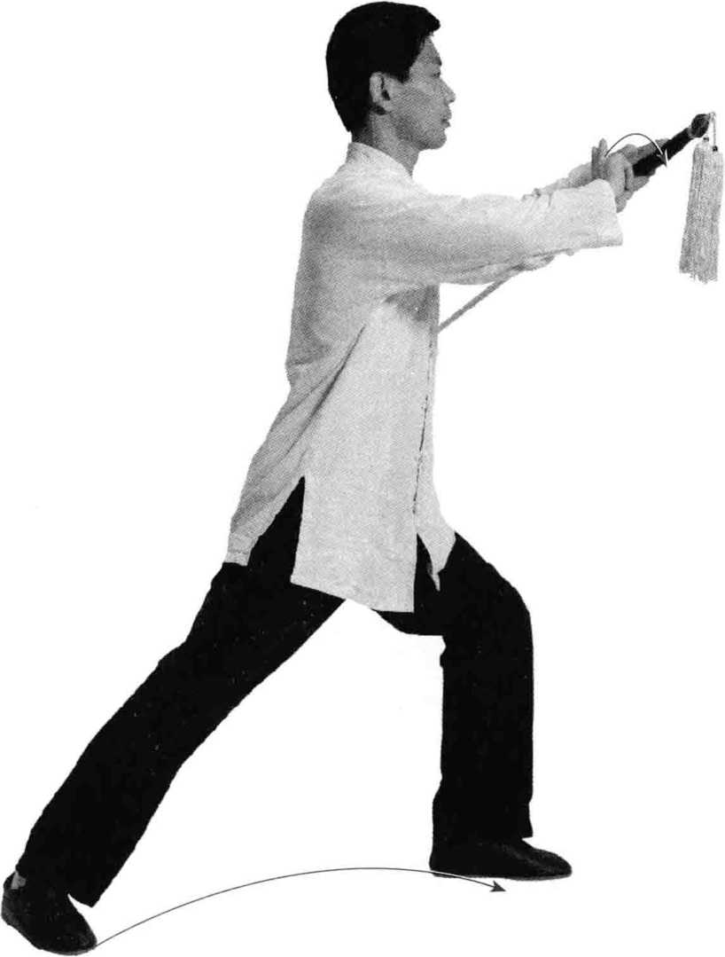重心向前移至右腿,蹬起左脚脚跟,使重心坐 在右支撑腿,成高歇步;同时左手持剑前穿,右手弧线下拉,向右转 腰撩起剑指与肩同高;转头目视剑指前方。