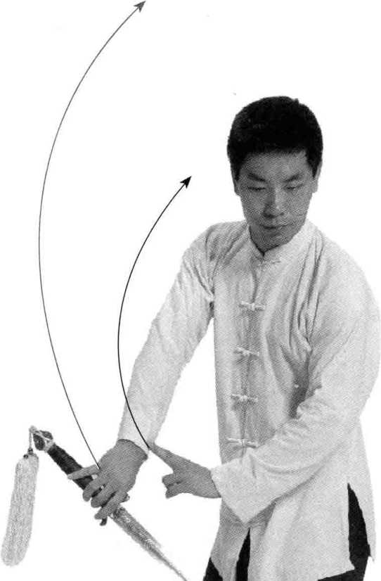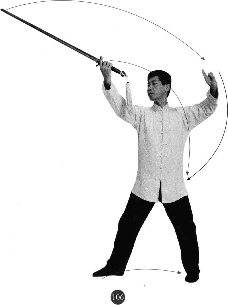 ①接上动,屈左膝,重心平移向左腿,蹬右腿,成右虚步;同 时,上体左转,右手持剑内旋,沿弧线向上撩剑,以下侧剑刃中前段 为着力点,左手随之向后一起摆动;目视剑尖。