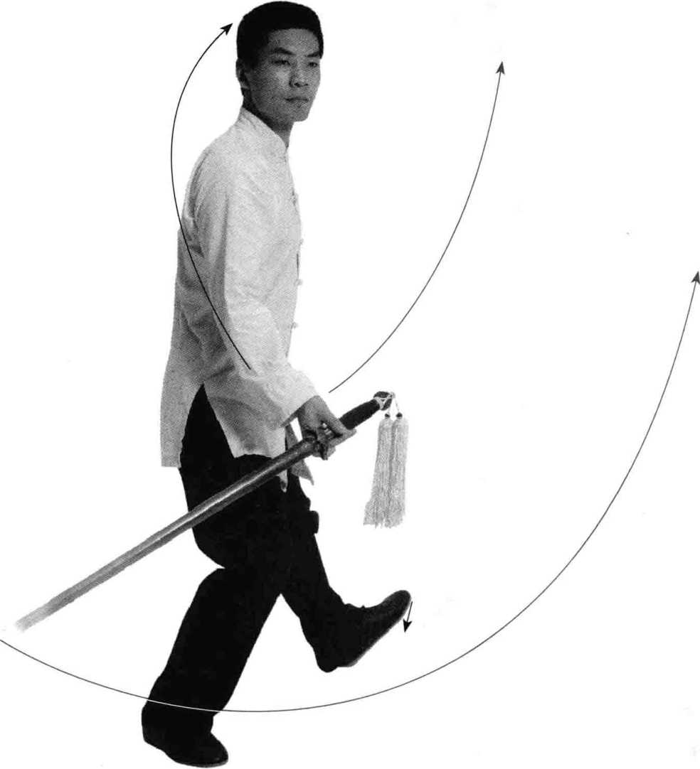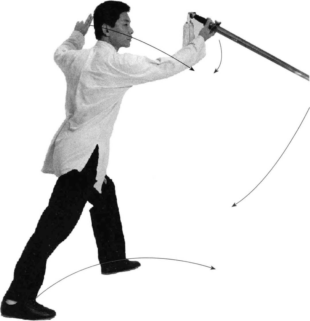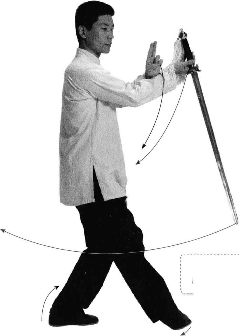 ①盖步挂剑:重心平移向左腿,出右脚向左脚前方盖步,脚跟 着地,脚尖外摆;同时上体转正,右手外旋持剑,剑尖朝下,左手剑 指向右手小臂内侧合拢;目视剑尖。