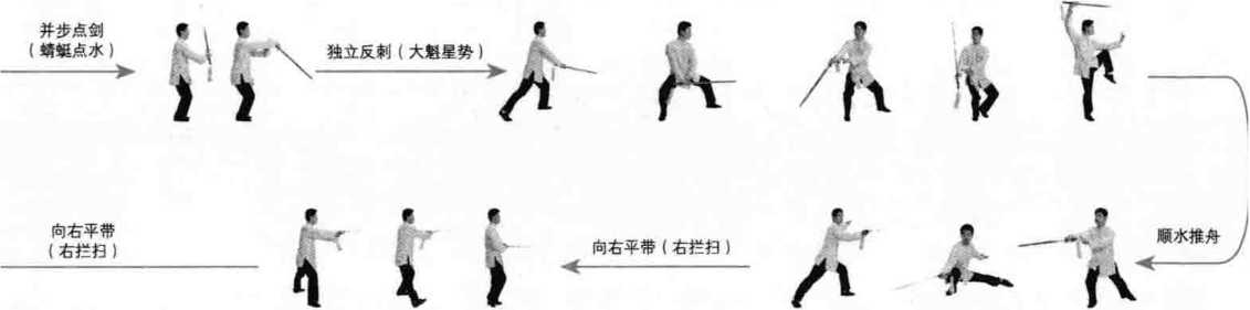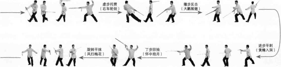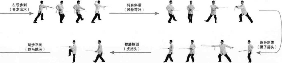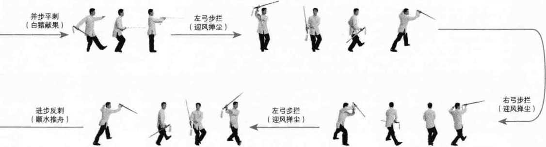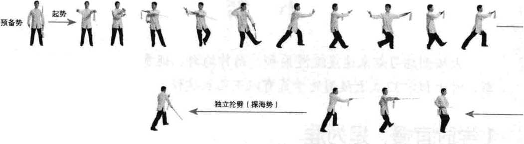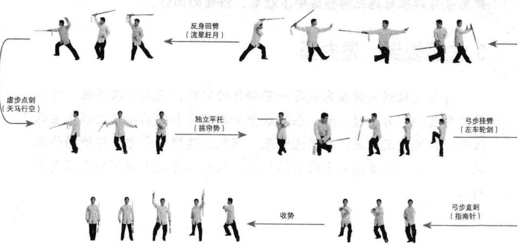 太极剑的速度缓慢柔和,但并非越慢越好,否则就会死气沉沉, 失去太极剑轻灵柔和、活泼流畅的特点。当练会32式太极剑后,要 有一段时间的熟练过程,需要反复练习、加快速度练习。这样练习的 作用是可以很好地化解套路中不连贯、僵硬的动作。
