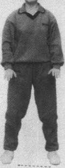 双足开立,与肩同宽,脚尖向前,双手分别叉于腰旁,上体端 正,头随颈部向前、向后摆动若干次;接着向左平转90°、向右平 转90。各若干次;接着头随颈向前向左向后向右环形摆动若干周, 再依相反方向摆动若干周。