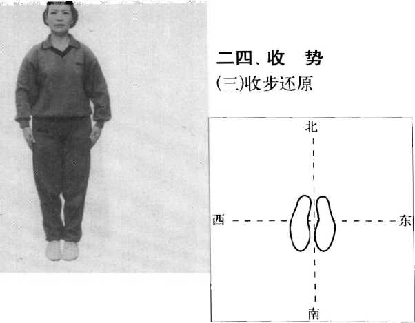 重心移至右腿,左腿提起向右腿靠拢,并步站立。两腕松垂, 两手分收于身体两侧,掌心向内,指尖向下。目视前方。