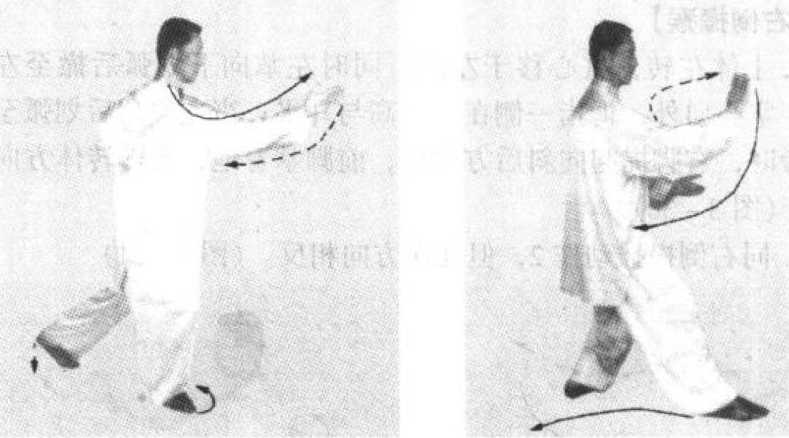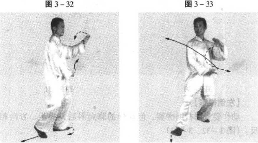 ③ 太极拳动作要求,其根在脚,由脚而上至腿,由腿而上至 腰,由腰而上至手指,完整一气,周身节节贯串。所以,右掌向 左后方搠出时,劲要起于脚,发于腿,主宰于腰,通于脊,由肩 到肘,由肘到手,节节贯串洌出,达到上下相随,以及劲路上的 要求。