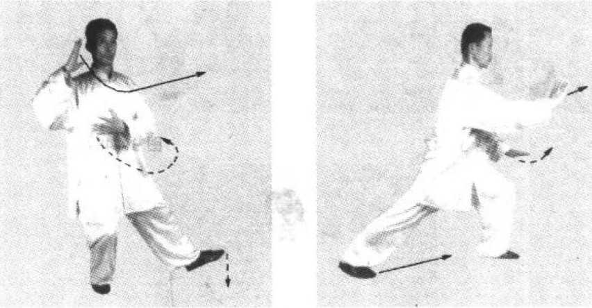 ② 右掌的下插和左掌的下按动作应与右腿的下蹲和上体前折