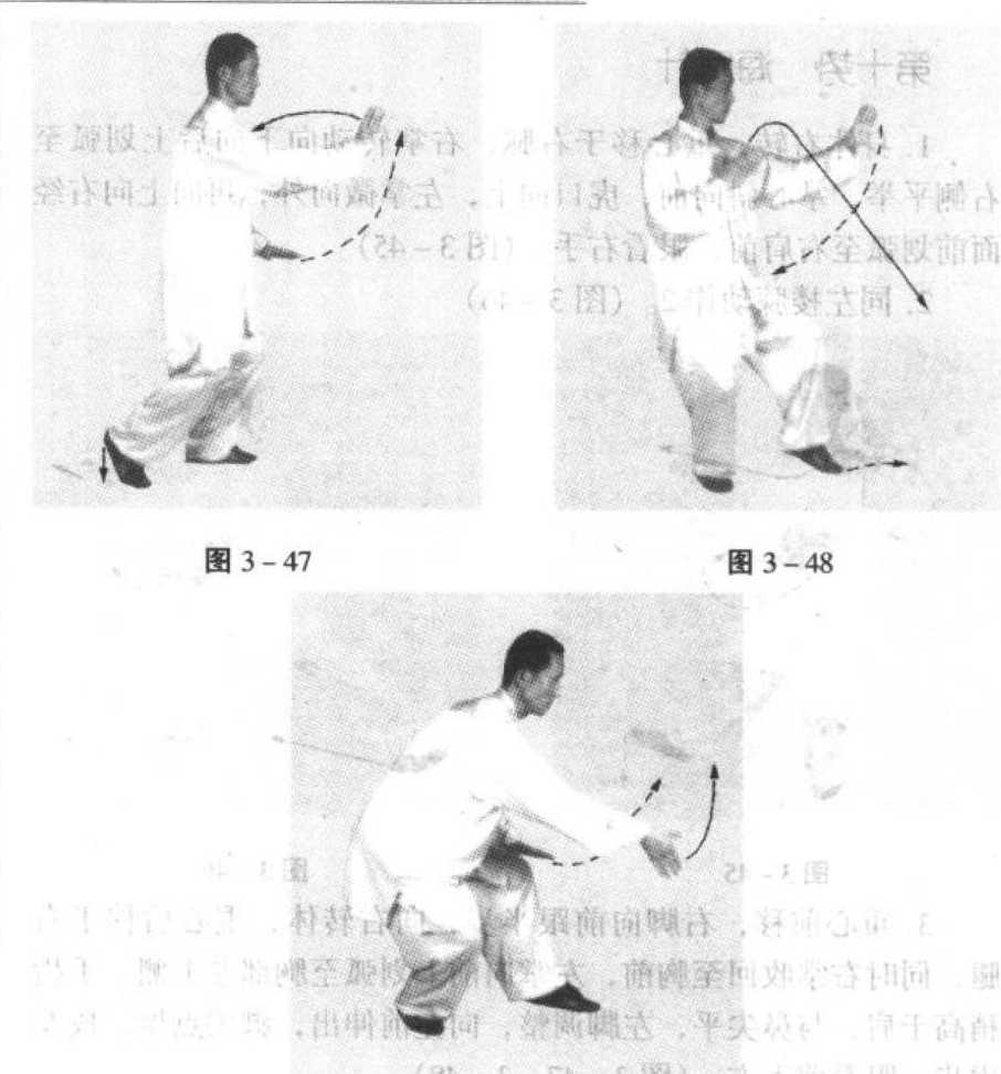 4. 上体左转,右掌向前向下随上体前折动作弧形插下,手 指向下,手心向左;同时左掌向前向左划弧至右膝外侧,手指向 前,掌心向下,与此同时右腿下蹲成左低虚步,眼看前下方。 (0 3-49)