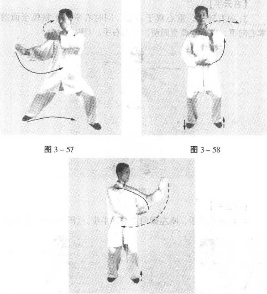 1. 向左转体,右脚尖里扣90度,左脚尖外展45度,使两脚 尖均向正前方(正南),同时左掌心转动向里,向上划弧至面前; 右掌向下,向左划弧至腹前,掌心逐渐转动向里,眼视左掌方 向。(图 3-57、3-58)