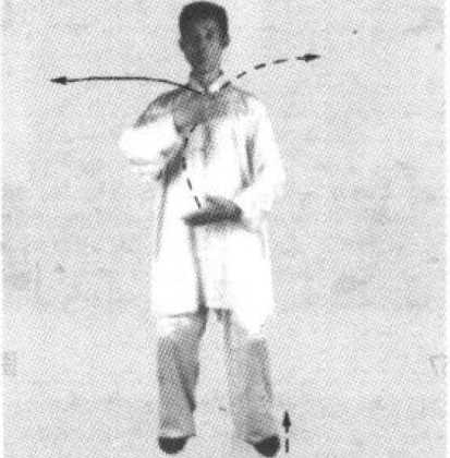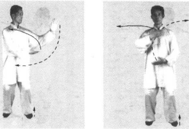 3. 向右转体,重心移于右腿,同时右掌向上划弧至面前,