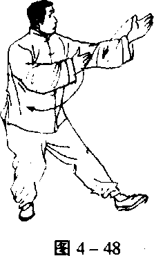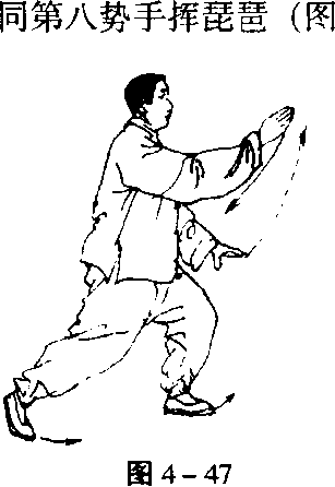 同分动2 “右搂膝拗步”,唯左右相反(图4-44、45、46)0