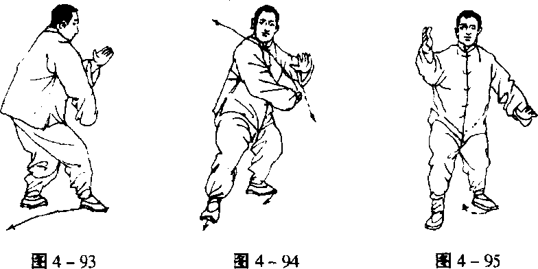 着地,重心逐渐移向右脚而全脚踏实,弓右腿,蹬左腿,左脚尖 内扣,成右弓步,同时,右掌以拇指侧向右后上方拗出,高与额 齐,左掌弧形下采,置于左胯前,掌心向下,目视右手机出(图 4 - 94 . 95)。