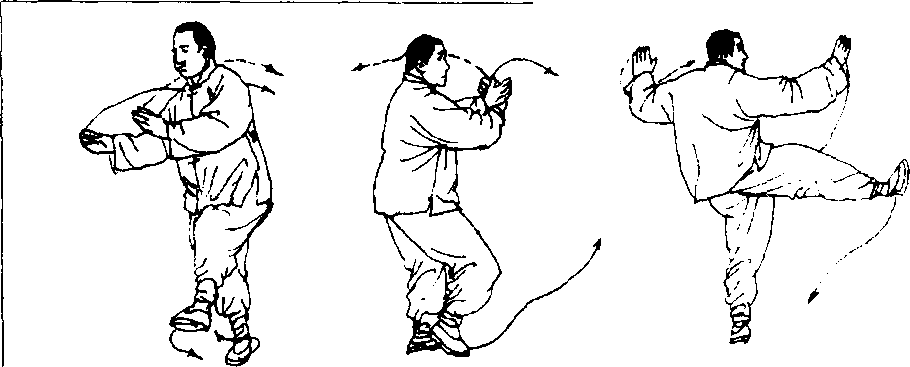 ② 转身时须借右脚碾地(一经破地,脚跟即离地)和左腿摆
