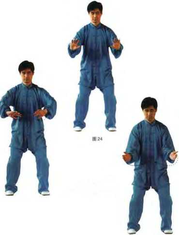 微屈膝下蹲同时两掌内旋外翻掌心向外缓缓向前拨出至两臂成圆目视前下方(图23)。图23图23图23图23