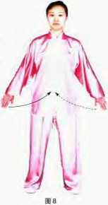 动作四上动不停。两腿膝关节稍屈同时两臂外旋向前合抱于腹前呈圆弧形与脐同高掌心向内两掌指间距约10厘米目视前方(图9)。