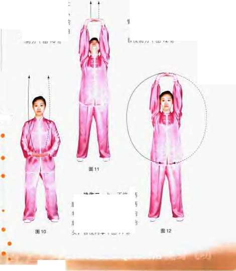 动作三上动不停。两臂继续上托肘关节伸直同时下额内收动作略停目视前方(图12)。