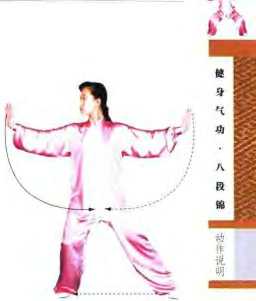 本式一左一右为1遍共做3遍。第3遍最后一动时身体重心继续左移右脚回收成开步站立与肩同宽膝关节微屈同时两掌分别由两侧下落捧于腹前指尖相对掌心向上目视前方(图22%本式一左一右为1遍共做3遍。第3遍最后一动时身体重心继续左移右脚回收成开步站立与肩同宽膝关节微屈同时两掌分别由两侧下落捧于腹前指尖相对掌心向上目视前方(图22%健气功八段锦动作说叫健气功八段锦动作说叫