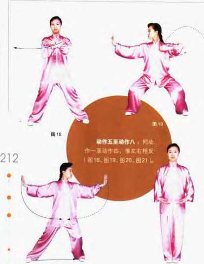 动作四上动不停。重心继续右移左脚回收成并步站立同时两掌分别由两侧下落捧于腹前指尖相对掌心向上目视前方(图17
