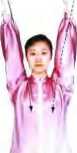 动作五两掌沿地面前伸随之用手臂带动上体起立两臂伸直上举掌心向前目视前方(圈49)