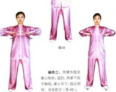 步站立与肩同宽同肘两掌向外经两侧上举掌心相对目视前方(图43)。随后松腰沉微身体重心缓缓下降。两腿膝关节微屈同时屈肘两掌经面前下按至腹前掌心向下指尖相对目视前方(图44)。