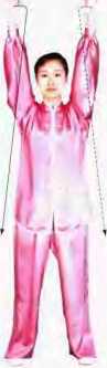 动作一接上式。两腿挺膝伸直站立同时两掌指尖向前两臂向前、向上举起肘关节伸直掌心向前目视前方(图45)