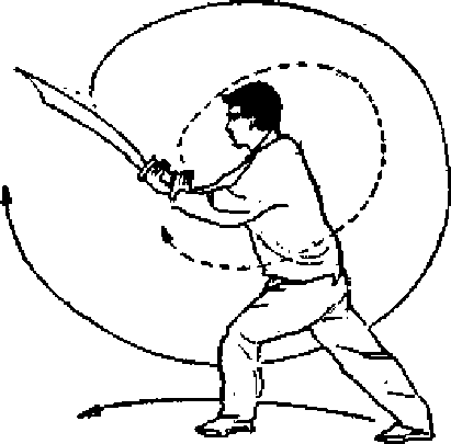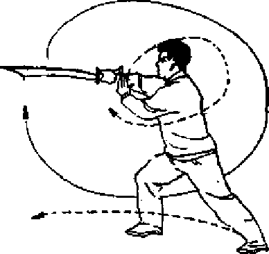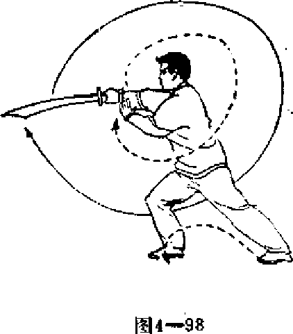 尖斜射地面*左掌随同附在右膀内侧搠开,目光随刀回视东 北方,趁势向西偏南上左足大半步成左小弓势*同时以阳手 把由身后右侧旁向西上撩,把与胸口齐高,刀尖与头顶齐 平,左掌按住刀把,眼观刀刃。(图4-97*胸向西)