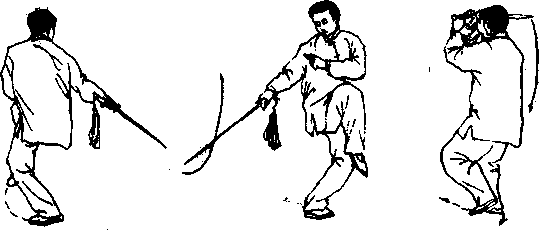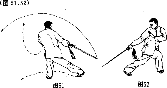 ①随重心前移,右腿屈膝上提成独立步,上体右转并微前 倾。同时,右手持剑向右后方截剑,手心朝下,剑尖斜朝下,略 低于膝。左手剑指屈肘摆至右肩前,手心朝右后。目视剑尖。 (图 54,55)