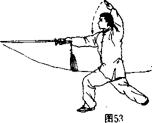 ②上体左转,左脚向前上步成左弓步。同时,右手搏剑经 上向前劈剑,与肩同高,剑尖略高于腕。左手剑指经下向左上 方划弧,臂呈弧形举于头上方,手心斜朝外。目视前方。(图 53)