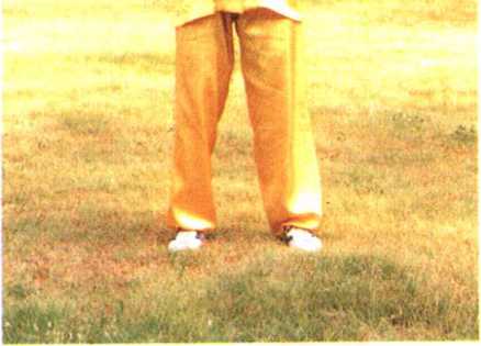 预备式动作完成后,左脚缓缓蹬 地,使重心徐徐右移,同时左脚脚跟和 前掌依次离开地面,并向左侧横开半 步,脚前掌、脚跟依次落地,两脚平行 站立。落脚后,身体重心缓缓左移,回 复到两脚中间上方,两脚平均负担体 重。目平视前方。