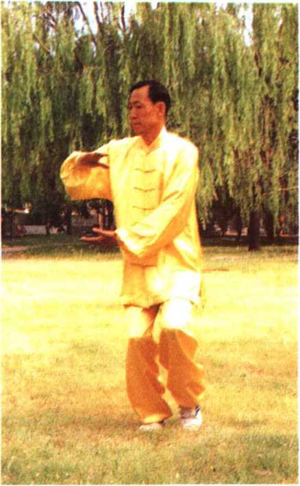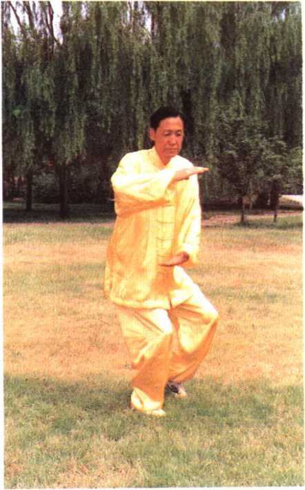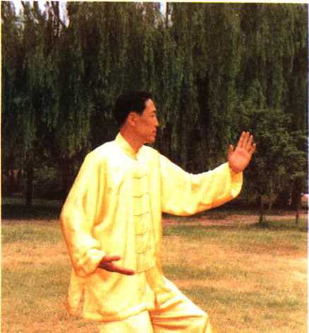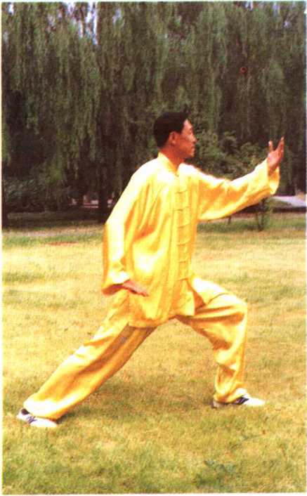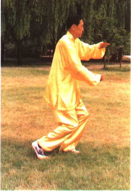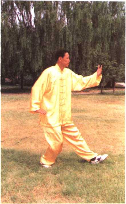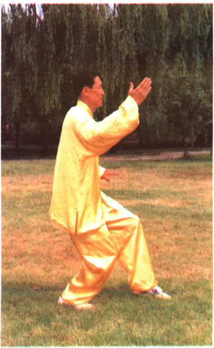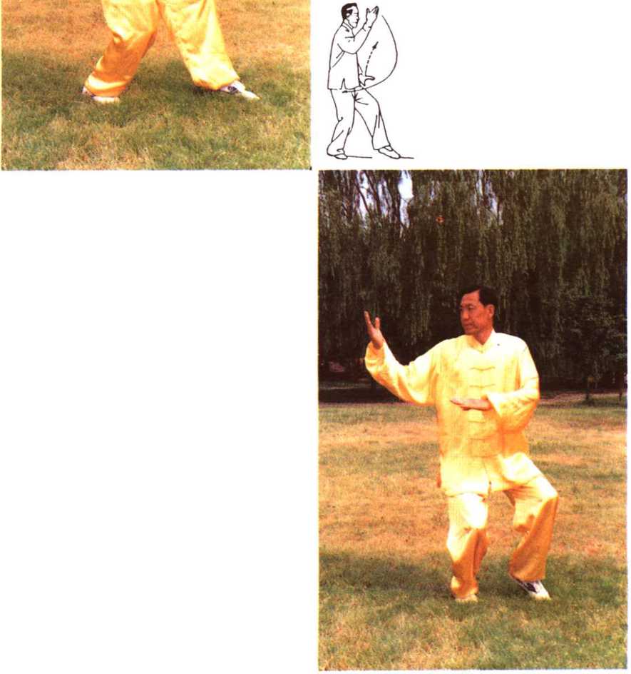 身体微左转,重心前移, 右脚提起,向前跟半步,脚前 掌着地。与此同时,屈收左臂 至前臂横平,左掌心翻向下 置于胸前;右手向前、向上、 向左划孤至腹前,两手于体 前成抱掌姿势。眼看左手。