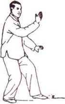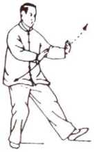 身体继续右转,带动两 臂绕摆(见示意图),左手绕 至右胸前,掌心斜朝下;右手 绕摆约成侧上举,肘微曲,掌 心斜朝上,指尖同眉高。两手 掌心斜相对成阴阳掌。在举 臂同时,回收左脚成丁步。眼 看左手变为看右 手。