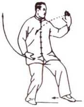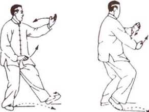 重心后坐,右脚跟落地踏 实,身体微向右转,左腿微伸,两 手胸前分展(见示意图)。