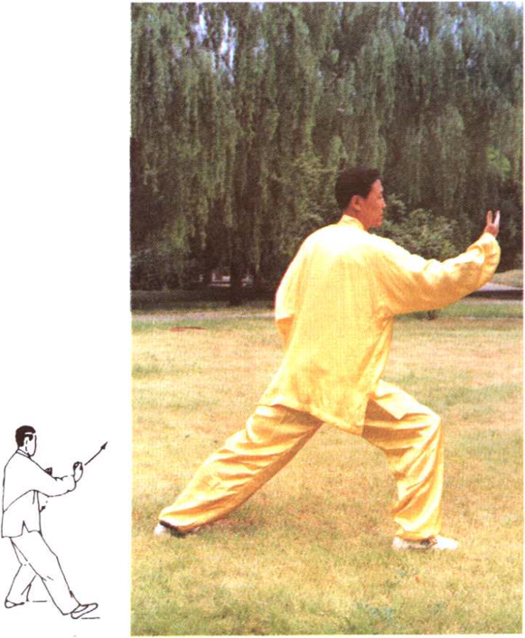 右腿伸,左膝屈,使髓带 动上体后移,右脚尖翘起(见 示意图)。