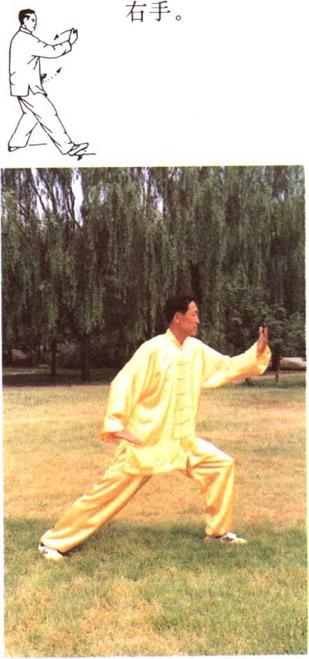 心。心。上体向右转,右脚向右 前方迈出,脚跟先着地(见示 意图)。身体前移,屈右膝成 右弓步。与此同时,两手向右 上、左下方分掌。眼看右掌