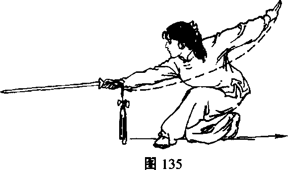 ②身体稍左转,左脚碾转成脚尖外摆,右脚跟离地,两腿 屈膝全蹲成歇步;右手握剑直臂前刺,剑尖高离地面约30厘 米,手心向上,左剑指向上直臂后摆,剑指高于头,虎口斜向 下;目视剑尖(图135 )o