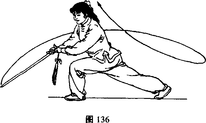 ①身体稍立起,右脚向后撤步,脚尖点地;右手握剑稍左 摆,左臂屈肘回收,左剑指附于右腕处;目视剑尖(图136 )o