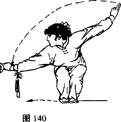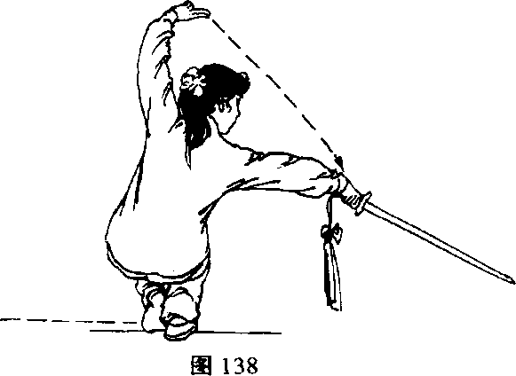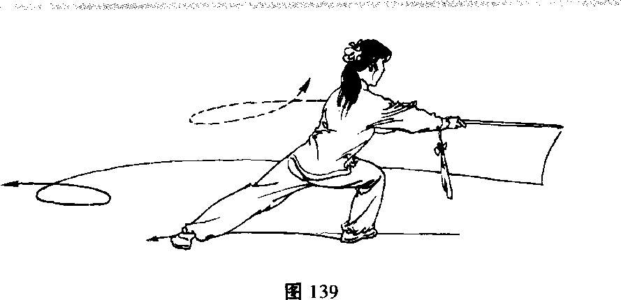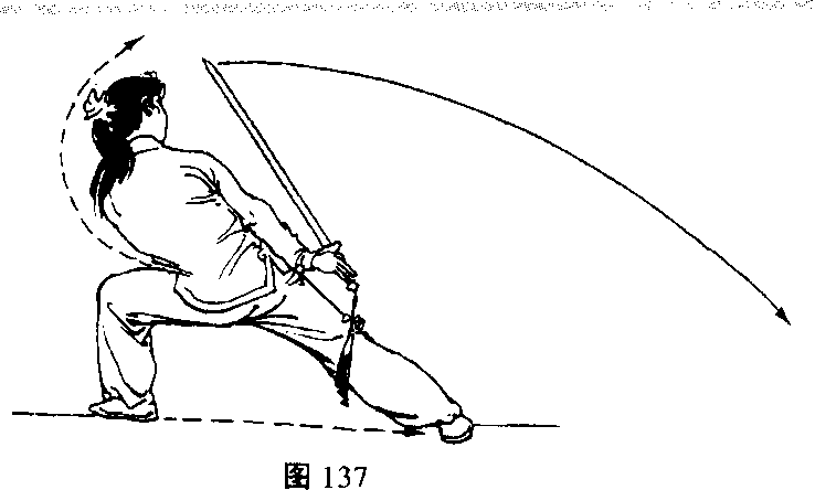 ②身体右转约180。;随转体重心右移,稍屈膝;同时右手 握剑随转体直臂右摆,随之重心左移,左腿屈膝,右腿伸直,上 体左倾,右手握剑,以腕为轴,使剑在体右侧平云,剑身斜立于 臂侧;目视剑尖(图137 )。