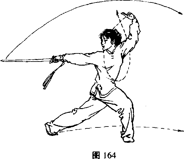 重心前移,右脚向前上步,屈膝,脚尖稍外展,左脚跟离 地,膝关节伸直成叉步;同时上体右转;右手握剑随转体向右 平斩,与肩同高,手心向下,左剑指向下、向前、向上绕至头部 左上方;目视剑尖(图164 )o