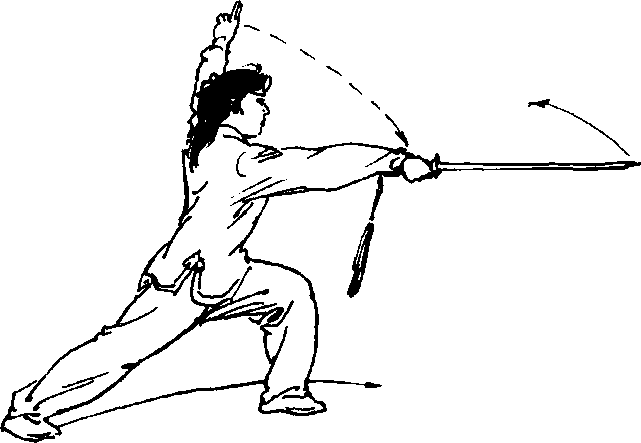 【要点】左剑指下落与剑的上举要同时,剑的前劈与剑指 要同时到位。