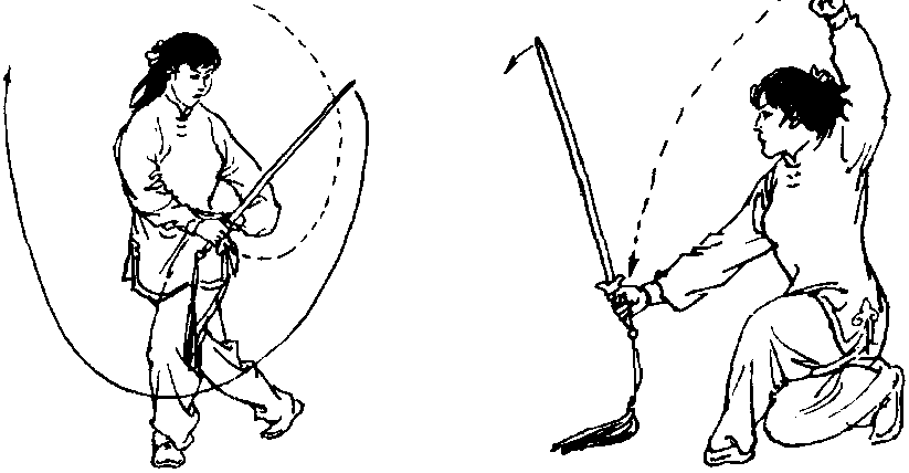 【要点】上步、转体与平斩要协调一致,腰要向右拧转,剑、 臂成一直线。